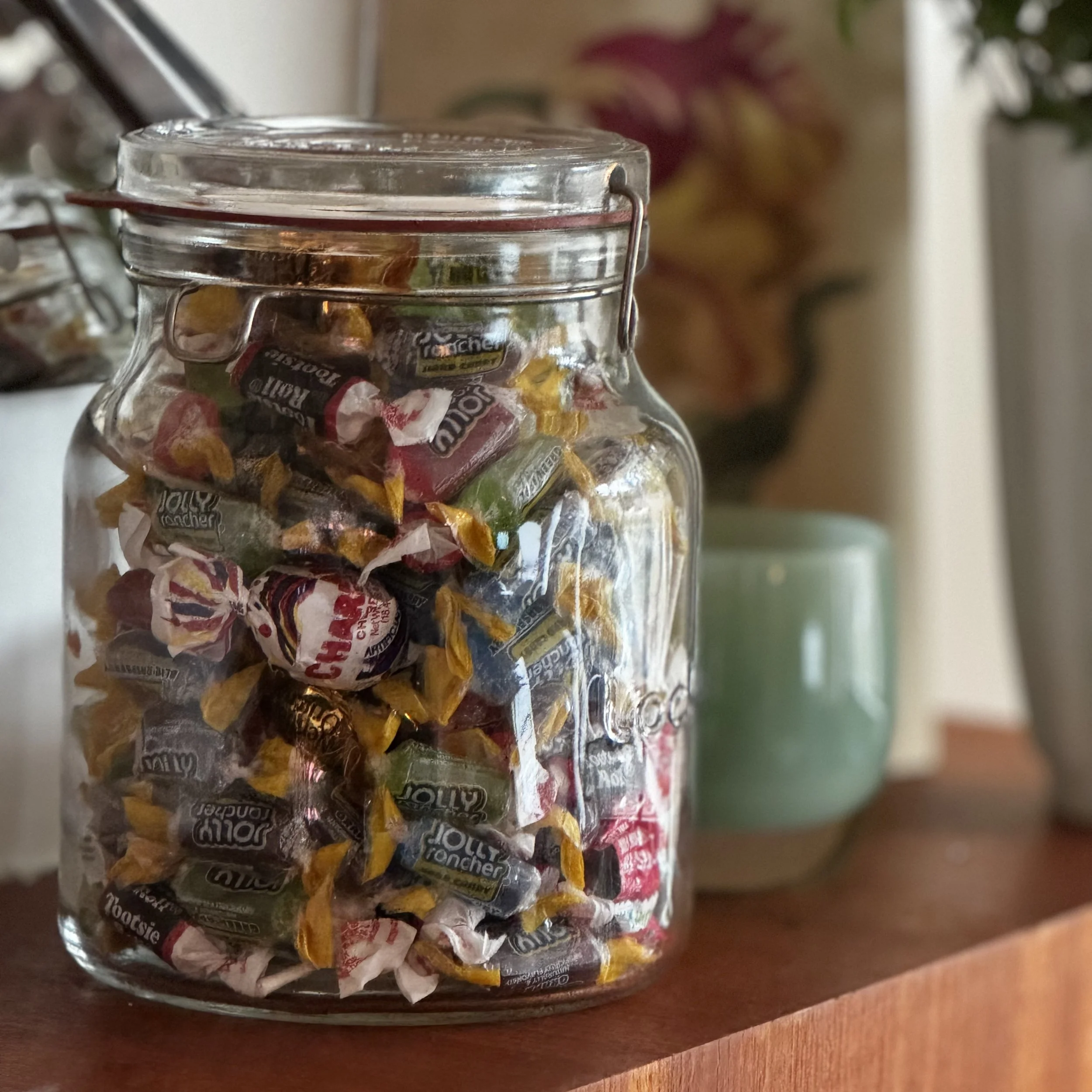 This candy jar is a visualization of abundance, and lives on my mantle where I curate a collection of things that make me and my family smile: bubbles, fresh cut flowers, kaleidoscopes, small cute Japanese wooden dolls that are colorful, yo-yo’s, cards with nice messages on them etc. Having a colorful and playful vignette creates a little boost of happiness, and will give you a little thrill . The full jar of candy is a reminder every day to feel the joy we felt as children, while we continue the hard work of adulting.