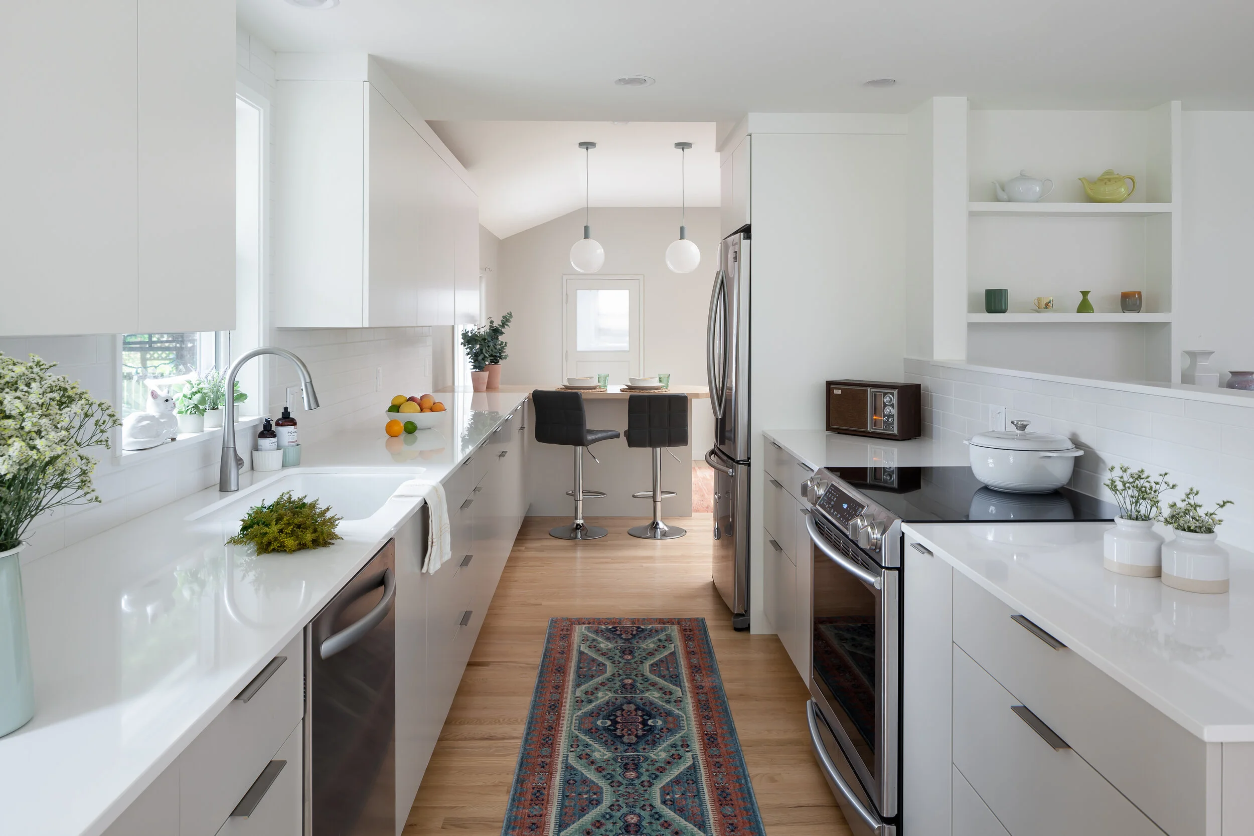 A couple of empty nesters with little birds who visit the nest often for large dinner parties and extended visits. Cabinets made in a shop that is 2 miles away. Homeowners antiques & pottery collection used as color inspiration. Durable, sustainable countertop selections & no-voc paint & flooring finishes used.